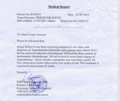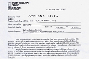 Devetomesečnom Sergeju Milićeviću otkriven je veliki tumor na mozgu koji je zahvatio optičke nerve, hipofizu i važne krvne sudove. Preporučena je operacija u inostranstvu u klinici "Acibadem" u Istanbulu pa su se roditelji obratili za pomoć medijima ne bi li sakupili dovoljno novca za lečenje.