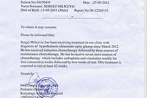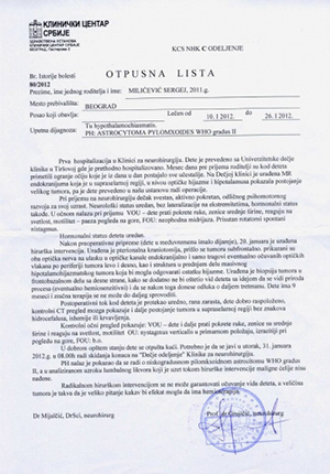Iako je poslednji snimak pokazao nastanak ciste koja se uvećavala, neurohirurg je posavetovao da se još malo pričeka sa operacijom i da se nastavi sa hemoterapijama, koje bi po njegovim predviđanjima trebalo da utiču na dalje smanjenje tumora. Plan je da u narednih sedam meseci Sergej primi još 28 hemoterapija, a da se operacija obavi kada bude još malo ojačao.